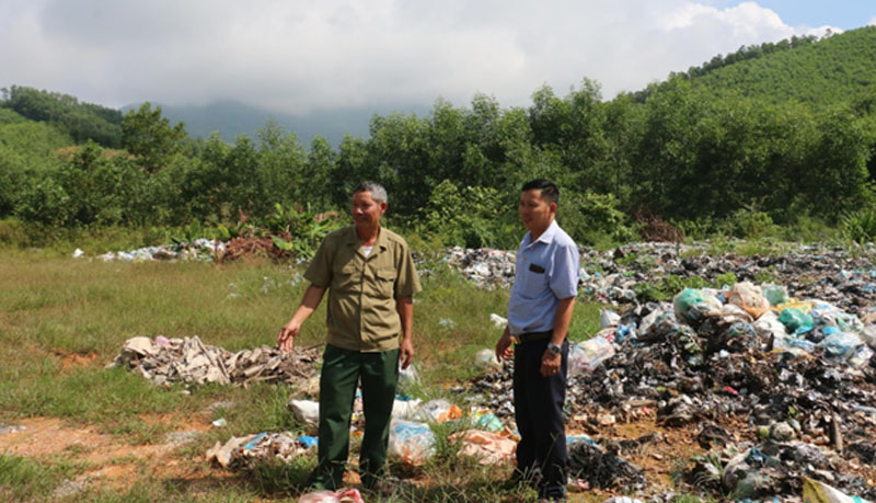 Ông Vi Văn Hùng (bên trái) và cán bộ xã Dương Hưu thăm bãi rác của xã
