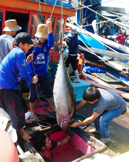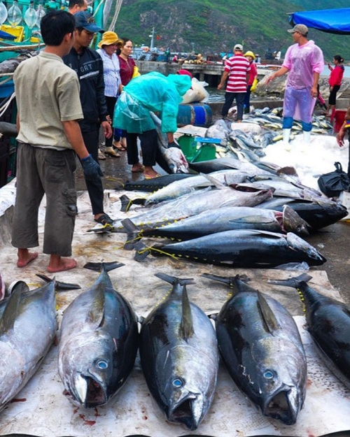 Những ngư dân cùng nhau chuyển cá ngừ lên bờ chờ thương lái đến mùa.