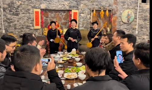 Du khách giao lưu văn nghệ tại Tày’s Homestay Khuổi Ky Bản Giốc, xã Đàm Thủy (Trùng Khánh). Ảnh: C.T.V