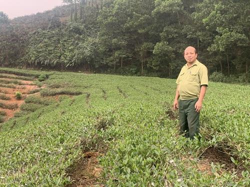 Ông Trần Tường- Chủ tịch HĐQT HTX Cựu Chiến Binh Hán Đà bên đồi chè của HTX