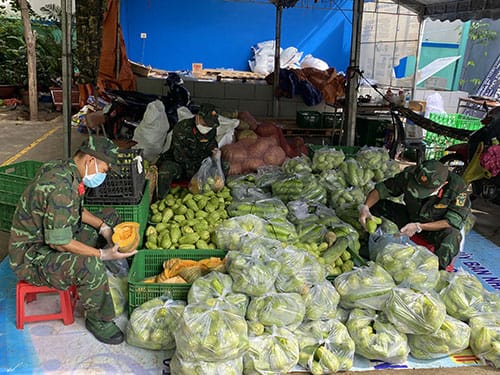 Các chiến sĩ bộ đội hỗ trợ UBND phường 11 đang phân chia củ quả thành từng phần để gửi cho bà con.
