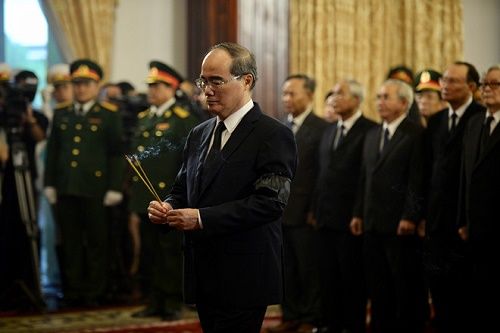 Đoàn Ban Chấp hành Trung ương Đảng do Tổng Bí thư Nguyễn Phú Trọng dẫn đầu vào viếng đồng chí Đỗ Mười. Ảnh: VGP/Nhật Bắc