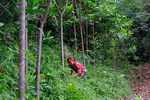 Chị Nông Thị Tám đang chăm sóc những cây keo của gia đình mình do Quỹ 1 triệu cây xanh cho Việt Nam và Vinamilk trao tặng