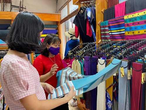 Nghệ nhân Trần Thị Ngọc Lan (áo sẫm) đang giới thiệu sản phẩm lụa tơ tằm với khách hàng. Ảnh: Bích Hời