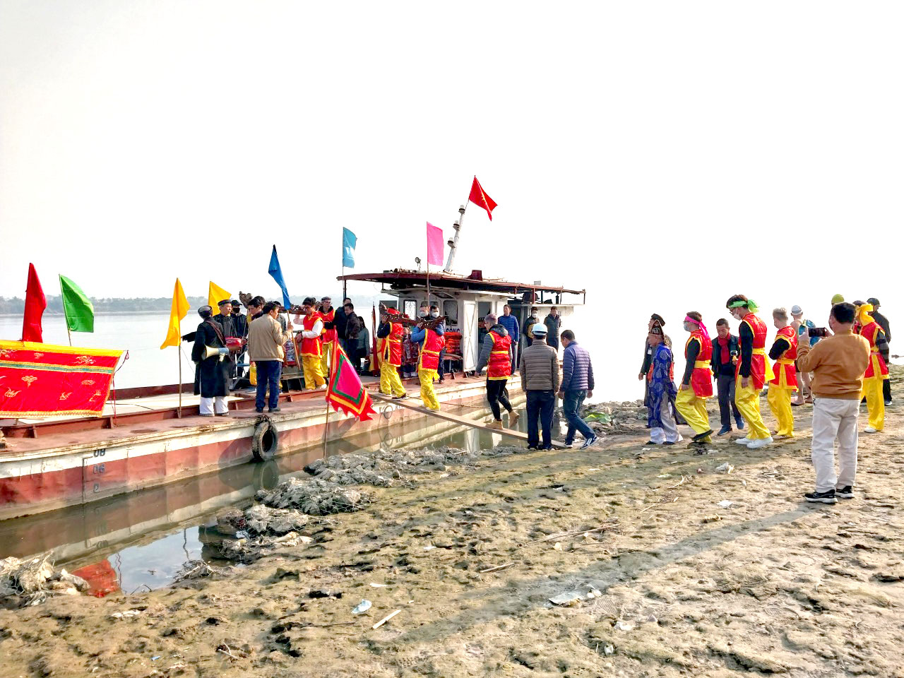 Chèo thuyền ra giữa sông Hồng để lấy nước nằm trong nghi thức lễ rước nước tại lễ hội (Ảnh: VCĐ)