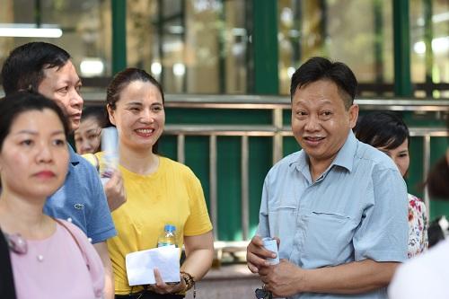 Nhiều phụ huynh học sinh thoải mái trao đổi trong lúc chờ đợi các em làm bài thi, dù thời tiết khá oi bức.