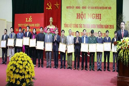 Kết quả công tác thi đua, khen thưởng năm 2018, huyện Mỹ Đức có 01 tập thể được trao Huân chương Lao động hạng Ba; 01 cá nhân được truy tặng Danh hiệu Bà mẹ Việt Nam anh hùng. Tập thể được khen thưởng cấp thành phố, gồm có: 03 Cờ thành phố; 06 Bằng khen; 15 Danh hiệu “Tập thể Lao động xuất sắc”. Về khen thưởng cấp thành phố cho cá nhân, gồm có: 01 Danh hiệu “Chiến sĩ thi đua thành phố”; 09 Bằng khen; 17 Danh hiệu “Người tốt - Việc tốt”. Đối với cấp huyện: Khen thường xuyên và Tổng kết năm cho 516 tập thể; 1.281 cá nhân. Trong đó, có 61 tập thể, 403 cá nhân đạt danh hiệu “Lao động tiên tiến”; 237 cá nhân đạt danh hiệu “Chiến sĩ thi đua cơ sở”. Khen đột xuất cho 02 Tập thể và 11 Cá nhân. Danh hiệu “Người tốt - việc tốt”, gương điển hình tiến tiến, trao cho 10 tập thể và 60 cá nhân.