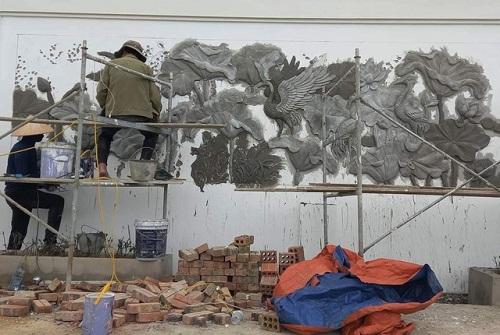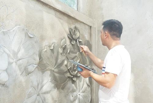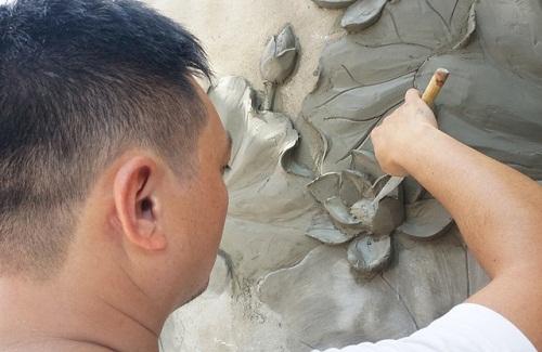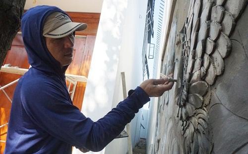 Sử dụng hỗn hợp xi măng và keo, với chiếc bay nhỏ, anh Tùng đắp tạo hình hoa sen, lá sen. Anh còn cùng người đồng nghiệp chịu trách nhiệm tạo hình những con hạc trên bức tranh sen hạc cho căn biệt thự tại xã Nghi Phú (thành phố Vinh).