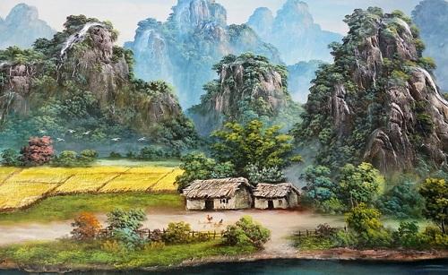 Anh Lê Quang Bài đang hoàn thiện bức tranh đồng quê cho một công trình.
