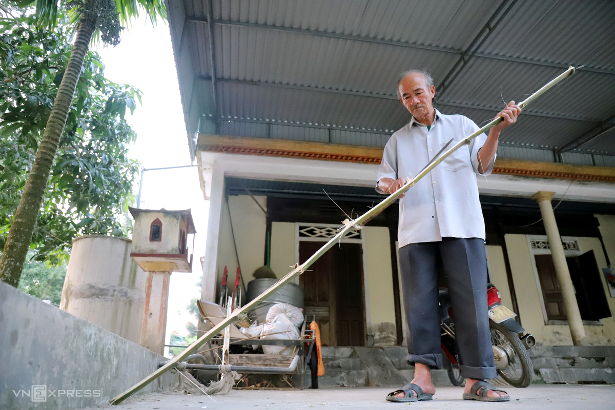 Ông Nguyễn Hữu Sơn, 80 tuổi, trú thôn Nam Giang, xã Thạch Long, chặt tre từ vườn nhà, chia khúc dài gần một mét rồi chẻ ra vót mỏng thành hàng trăm chiếc nan, độ dày của nan khoảng 1,5-2 mm. Ông thường chuẩn bị hai bó nan tre để đan một chiếc thúng.