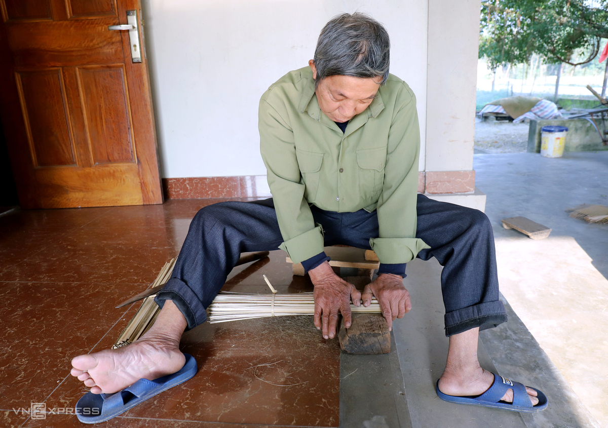 Ông Phạm Chí Dần, 72 tuổi, trú thôn Hội Cát, xã Thạch Long, bó hàng trăm chiếc nan nứa lại, xoa lên một khúc gỗ dày vát lõm phần giữa để làm rụng những phần xơ nứa.