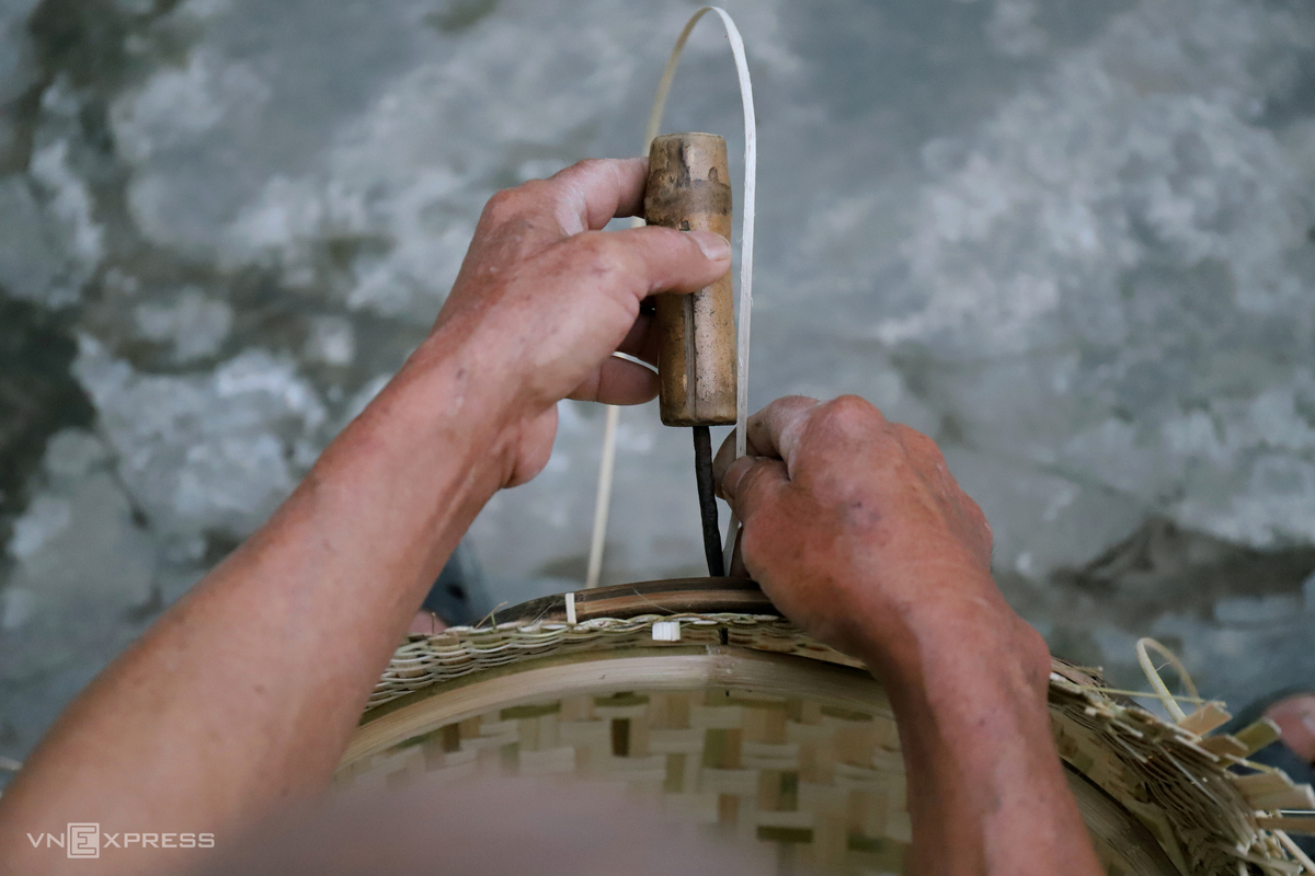 Mỗi chiếc thúng, rổ, rá, mẹt... đều có cấu tạo hai vành, gồm vành trong và vành ngoài. Sau công đoạn vào vành cho sản phẩm, người thợ dùng đục tạo lỗ nhỏ để quấn dây mây xung quanh. Một kg dây mây mua với giá 17.000-18.000 đồng.