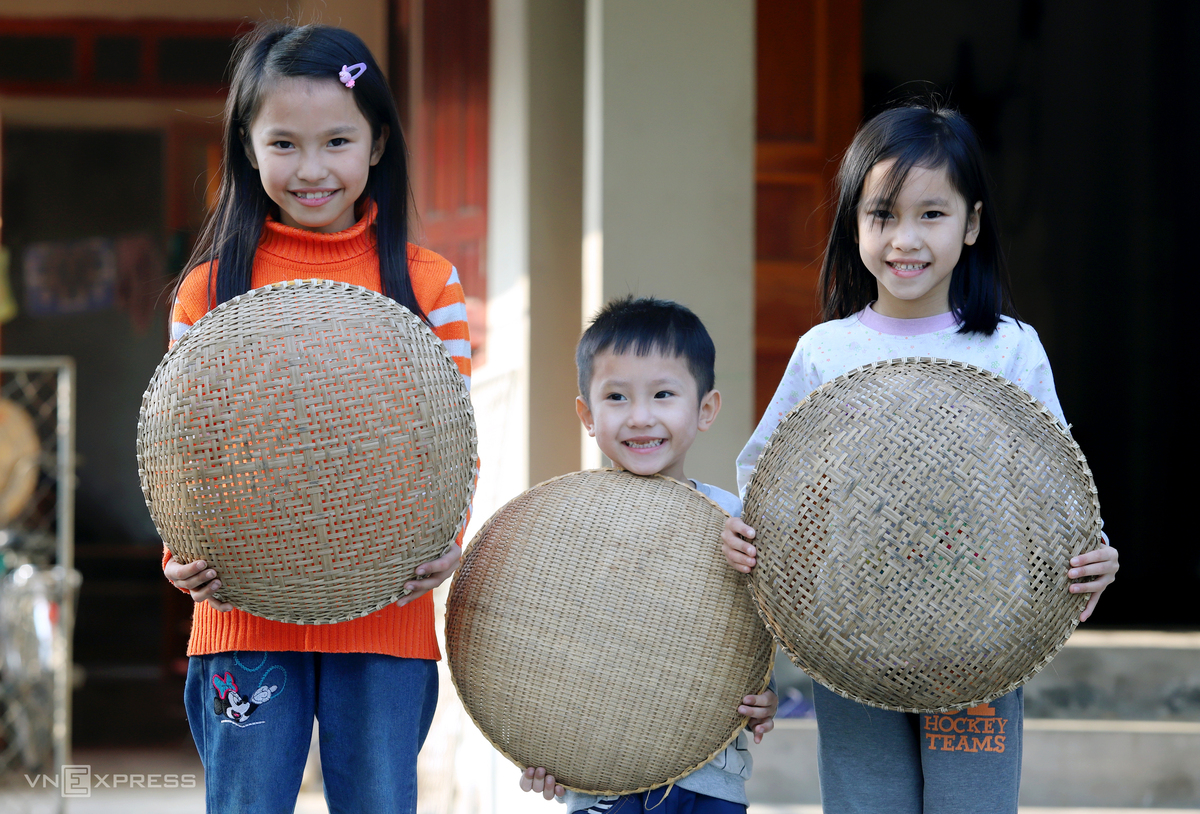 Ba người cháu của ông Phạm Chí Dần khoe các sản phẩm thủ công của ông bà. Giá một chiếc thúng là 50.000-55.000 đồng, còn rổ, mẹt và sàng thì 30.000-35.000 đồng/chiếc.