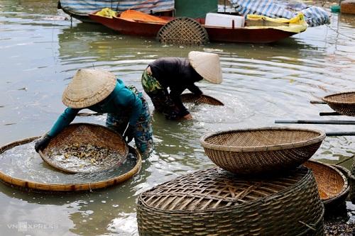 Chị Hà (góc trái) đang rửa hến sống, chuẩn bị đưa vào bếp để nấu. Ảnh: Đức Hùng