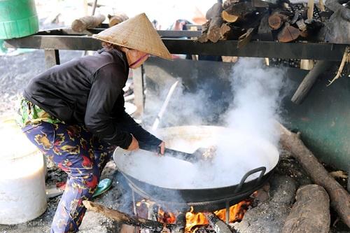 Một phụ nữ đang đảo hến khi nước trên chảo gang sủi bọt. Ảnh: Đức Hùng