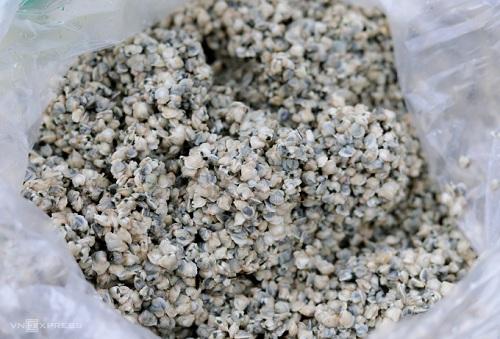 Ruột hến sau khi đãi sạch được bỏ vào túi nylon để bán cho khách. Ảnh: Đức Hùng