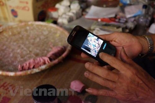Ngoài cuốn sổ nhỏ, chiếc điện thoại cũng là một trong những công cụ để ông Giáp lưu lại kỉ niệm mỗi lần đi dạy nặn phỗng đất. (Ảnh: Diệp Anh/Vietnam+)