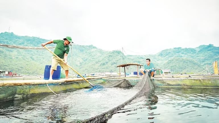 Sáng sớm, khi sương mù chưa tan trên mặt sóng, ngư dân đã cho cá ăn, kiểm tra từng mắt lưới và theo dõi sự thay đổi của nguồn nước.
