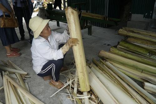 Công nhân bóc tách bẹ chuối trước khi đưa vào máy chẻ, ép thành sợi.