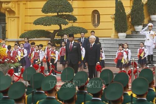 Đúng 9h30, đoàn xe chở Quốc vương Brunei DarussalamSultan Haji Hassanal Bolkiah cùng các thành viên trong Đoàn tiến vào Phủ Chủ tịch. Tổng Bí thư, Chủ tịch nước Nguyễn Phú Trọng ra tận cửa xe nồng nhiệt chào đón Quốc vương Brunei Darussalam Sultan Haji Hassanal Bolkiah. Đông đảo các cháu thiếu nhi Thủ đô vẫy cờ Việt Nam, Brunei, chào mừng Đoàn và tặng hoa Quốc vương Brunei Darussalam Sultan Haji Hassanal Bolkiah.