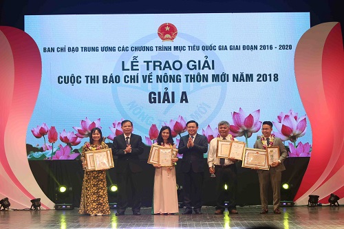 Phó Thủ tướng Vương Đình Huệ và Bộ trưởng Bộ NN&PTNT Nguyễn Xuân Cường trao giải A cuộc thi báo chí về Nông thôn mới năm 2018