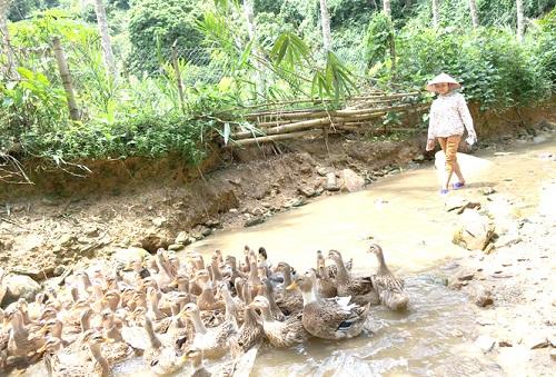 Tận dụng nguồn nước từ khe suối Minh Hương, chị Vân chăn thả vịt thịt.